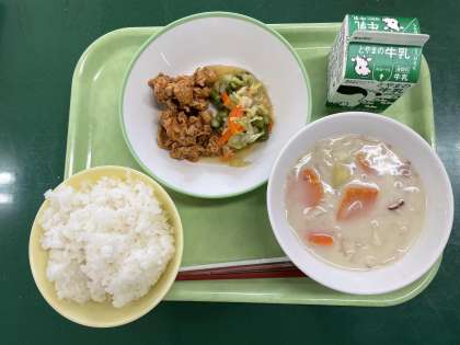 <献立> ごはん 牛乳 ポークチャップ アスパラサラダ 秋の香りシチュー