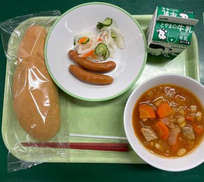 <今日の献立> コッペパン 牛乳 あらびきウインナー 大根サラダ ポークビーンズ