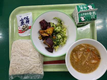 <今日の献立> ソフト麺 牛乳 ソフト麺の肉みそ 大学いも 野菜のドレッシング和え 味付け小魚