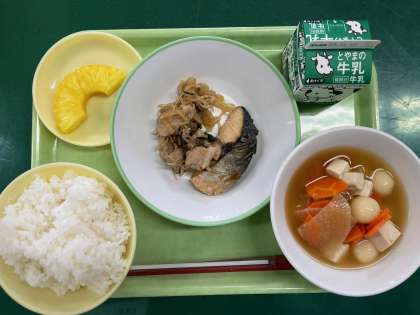 <今日の献立> ごはん 牛乳 ふくらぎの西京焼き しらたきのピリ辛炒め 白玉汁 パインアップル