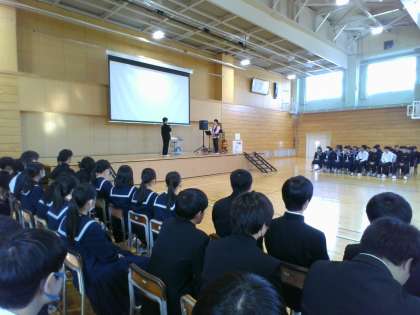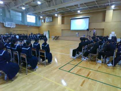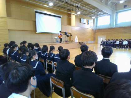 5・6時間目に「先輩に学ぶ講演会」がありました。河合電気の河合良さんをお招きして学生時代のお話を聞きました。生徒は「今までの気持ちや夢などたくさんの思いを歌にしていてすごいと思いました。とくに感謝という歌では学生の時の思いや生活を歌で表しているのが印象に残っています。」や「久しぶりに河合さんの歌が聞けて嬉しかったです。」と感想を書きました。また、代表生徒のお礼の言葉では「これからの進路学習で活かしていきたいと思いました。」と話しました。