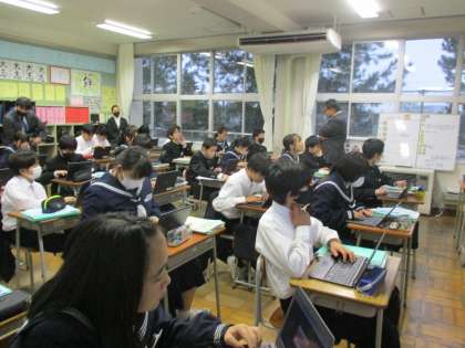 1A英語の授業では、ジャムボードを活用して現在進行形を用いた表現活動をしました。友達の表現を参考にしながら、熱心に取り組んでいました。