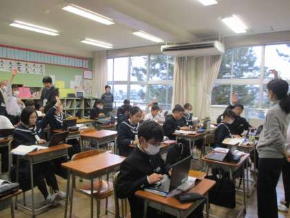 1B国語の授業では、自分で選択した故事成語について、意味や使い方、例文を紹介するスライドを作成し、発表を行いました。身近に感じる例文が発表されると、生徒は共感し、生活の中で使ってみよう、という声が上がっていました。