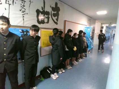 今朝、生徒玄関前で挨拶運動が行われました。今週は3Aが担当でした。