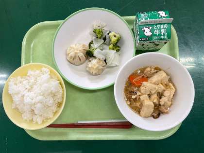 <献立> ごはん(有機米) 牛乳 小籠包 大根とブロッコリーのえごまサラダ 豆腐ときのこのあんかけ煮