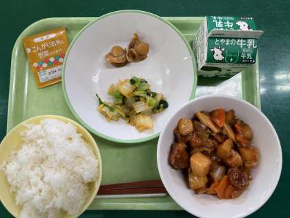 <今日の献立> ごはん 牛乳 ほたての香味焼き 生姜びたし 酢豚 野菜ふりかけ