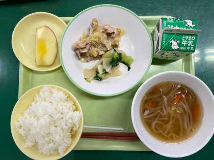 <今日の献立> ごはん 牛乳 豚肉の塩こうじ炒め かぶの色どり ワンタンスープ りんご