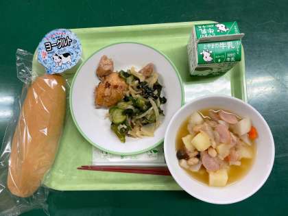 <今日の献立> 米粉コッペパン 牛乳 照焼きチキン 海藻サラダ 豆ときのこのスープ煮 ヨーグルト