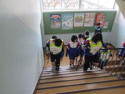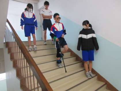 1/19(金) 家庭科の授業で「高齢者体験」を行いました。おもりを手首・足首にっつけ、サポーターで関節を固定し、白内障体験ゴーグルをつけ、実際に階段の上り下りをしました。生徒は「見え方が違う」「いつもより動きにくい」と言っていました。このような特徴から、家庭内事故をどのように防いだら良いか、生徒達は考えていました。