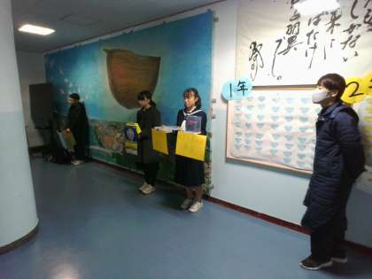 生徒会執行部 1月の特別活動 公開日 2024/01/22 更新日 2024/01/22 生徒会 生徒会執行部の1月の特別活動の様子です。 ・書き損じハガキの回収 ・友情の絵ハガキによる募金活動 ・インクカートリッジの回収 ・能登半島地震の募金活動 1/26(金)まで実施しています。