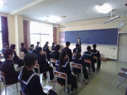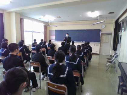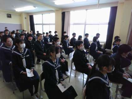 私立高校一般入試に向けて学年集会を行いました。教頭先生と学年主任の先生から激励の言葉をいただきました。明日は各学校ごとの試験になります。頑張れ3年生!!