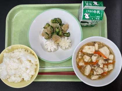 <今日の献立> ごはん 牛乳 えび包子 華風和え マーボー豆腐
