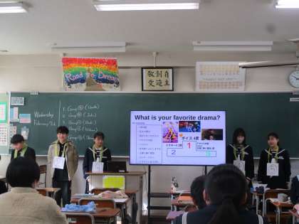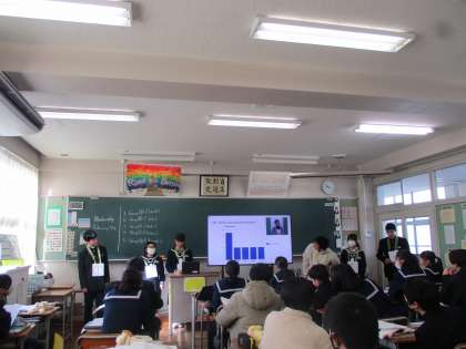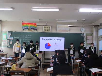 2学年 授業のようす 公開日 2024/02/07 更新日 2024/02/07 第2学年 英語の授業で、プレゼンテーションを行いました。クラスで人気のあるものを調査し、グラフにまとめ、学習した比較級や最上級を用いながら発表することができました。発表を聴いていたALTの先生からも、頑張りを褒めていただき、生徒たちは嬉しそうでした。