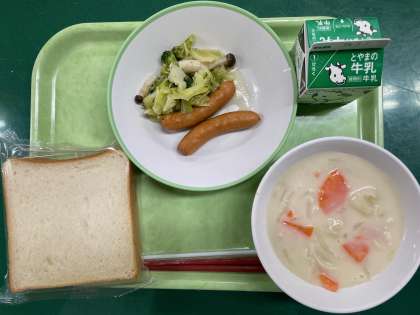 <今日の献立> 食パン 牛乳 あらびきウインナー ブロッコリーときのこのアヒージョ 米粉シチュー