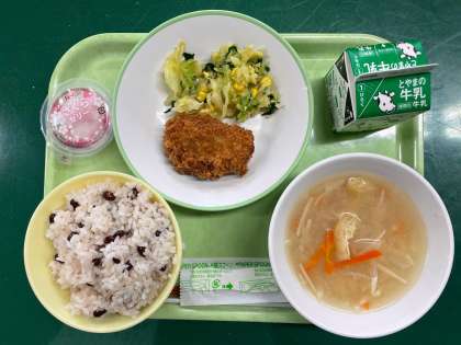 <今日の献立> 赤飯 牛乳 とんかつ コーン和え みそ汁 さくらゼリー