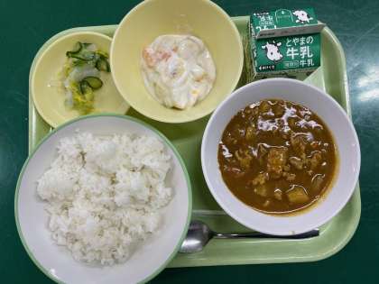 <今日の献立> ごはん 牛乳 カレーライス フレンチサラダ フルーツヨーグルト