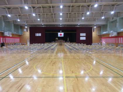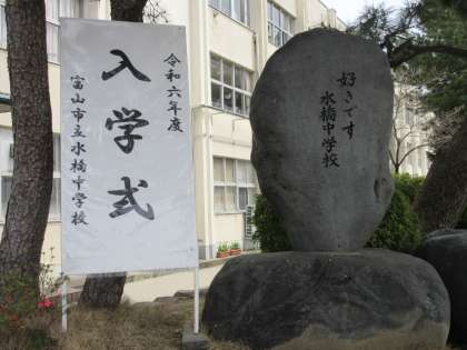 入学式の準備が整いました。 (写真上:石碑「好きです 水橋中学校」) (写真下:会場となる体育館)
