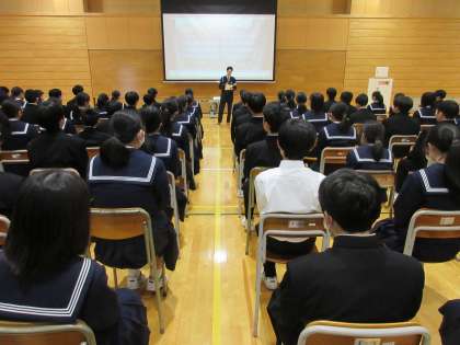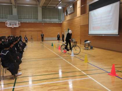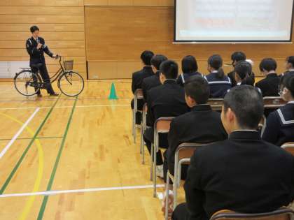 (写真中:主に自転車利用のルールやマナーについてお話をしていただきました)