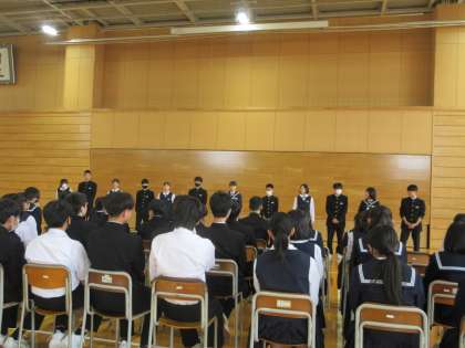 本日の学年集会では、前期学年生徒会のメンバー紹介を行いました。一人一人、どんな学年・学級をつくっていきたいか、熱い思いを発表していました。