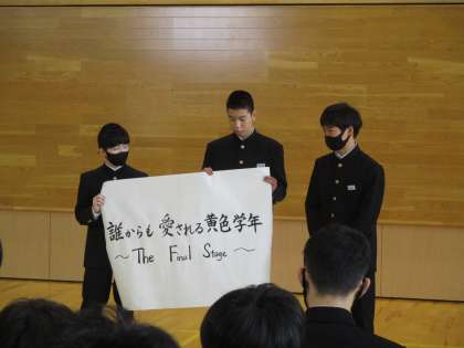 「誰からも愛される黄色学年〜The Final Stage〜」義務教育の最終段階である1年間、愛される人・学年になれるように、一人一人が思いやりの気持ちをもって、意識して行動していこうと呼びかけました。