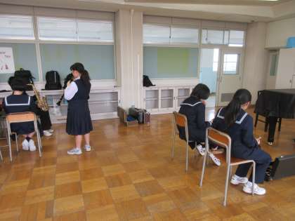 (写真上:吹奏楽部 上級生が1年生に楽器を教えてくれています)