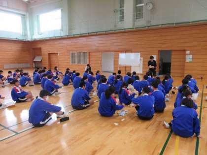 3学年 授業風景 公開日 2024/04/30 更新日 2024/04/30 第1学年 4/30(火) 3学年のようすです。 3Aと3Bが合同で体育の授業中です。配布物を配られ、先生のお話を聴いています。