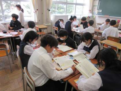 1学年 授業風景 公開日 2024/05/29 更新日 2024/05/29 第1学年 1学年のようすです。 (写真上:1A 国語 『ダイコンは大きな根?』班で話し合ってプリント学習) (写真下:1B 英語 発音の練習中です)