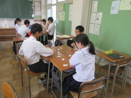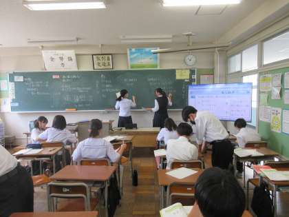 (写真上:2A 数学 連立方程式の解き方を教え合っています)