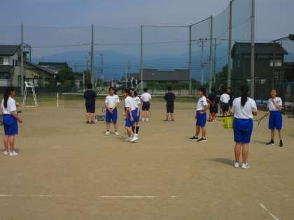 (写真上:テニス講座 男女ごとに打ち合いをしています)