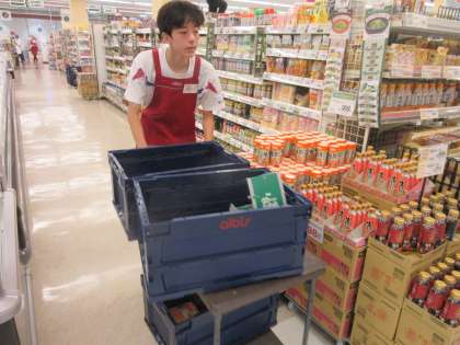 (写真上:アルビス ミューズ店 台車に商品を載せて、売り場へ陳列していきます。「春雨のコーナーはどこだっけ?」)