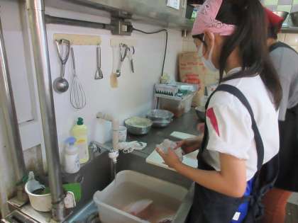(写真下:ダック山崎商店 今日はフライドチキンの調理にチャレンジです。パック詰めのチキンは大きいんですね!)