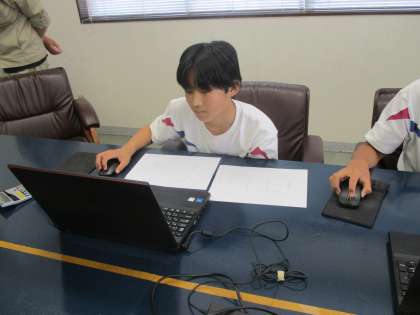 (写真下:小林建設株式会社 指導ボランティアの方から、パソコンを用いたデータ作りを学んでいます)