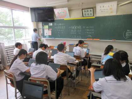 (写真上:1A 数学 クロムブックで互いに問題を出し合っています)