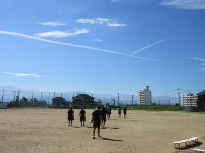 (写真上:陸上競技部 小休止を終え、グラウンドへ向かいます。飛行機雲が見守っています)