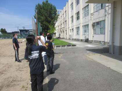 (写真上:災害発生時、水橋中学校を第2次避難所として利用するため、教職員がどのように行動するべきかを知るための訓練です。まずは校舎の安全の確認です)