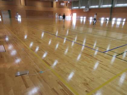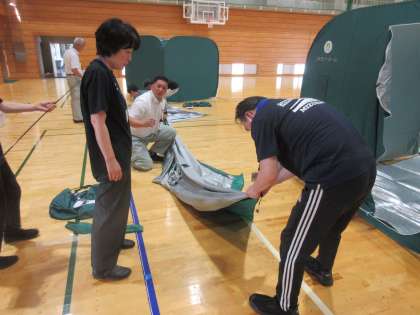 (写真中:第2次避難所として体育館を使用する場合、区画分けをしていきます。2メートルごとにロープを張っていきます)