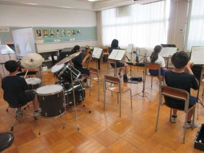 (写真上:吹奏楽部 ロングトーンの練習です)