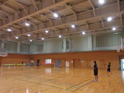(写真下:女子ソフトテニス部 体育館でペアを組んで練習しています)