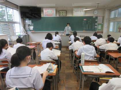 (写真下:1B 国語 単元テストについてお話を聞いています)