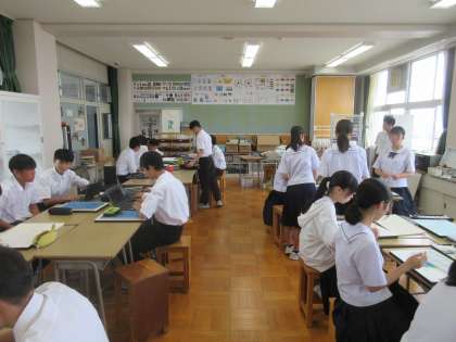 (写真下:2B 美術 みんなでアイディアを出し合いましょう)