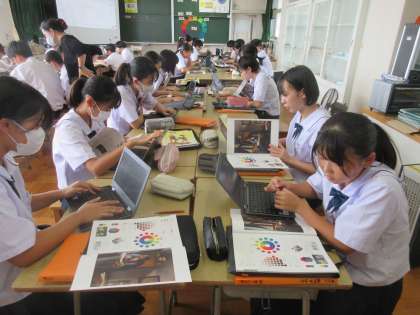 1学年 授業風景 公開日 2024/09/03 更新日 2024/09/03 第1学年 1学年のようすです。 (写真上:1A 英語「教科書の本文をすらすら音読してみよう」) (写真下:1B 美術「『色相環』をクロムブックを使って作成してみよう」)