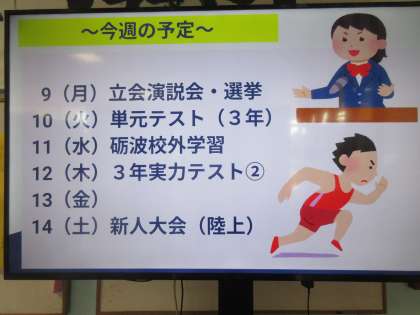 あなたと選挙と駅伝と 公開日 2024/09/06 更新日 2024/09/06 最近の水中の様子 9/6(金) 今週も週末を迎えました。 朝から気温が上昇し、日差しも強くなりましたが、子どもたちは駅伝部も選挙運動も頑張っています。 「給食は何かな?」 「朝ごはんは食べた?」 「月曜日は選挙本番だー!」 土・日はゆっくり心と体を休めてくださいね。
