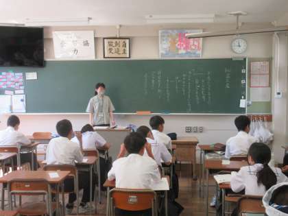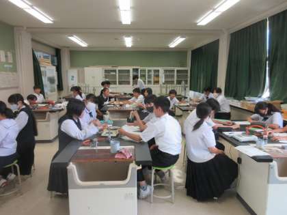 2学年のようすです。 (写真上:2A 理科 ガスバーナーを使って実験です) (写真下:2B 国語 『盆土産』)