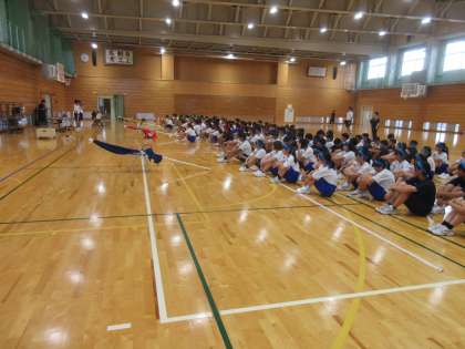 体育大会練習 雨モード 公開日 2024/09/19 更新日 2024/09/19 生徒会 9/19(木) 1限は体育館で全体練習です。全校生徒が素早く集合し、団リーダーの指示のもと整列して、練習開始を待っています。