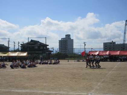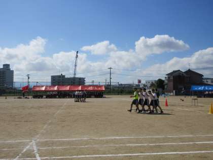ムカデ競走と二人三脚、三人4脚を組み合わせて、タスキをつなぎます。