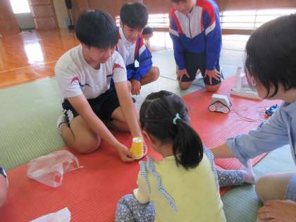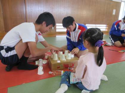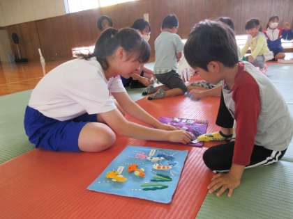 3年生 水橋幼稚園との交流 その1 公開日 2024/10/15 更新日 2024/10/15 第3学年 3年生の家庭科の課題で製作した「幼児が喜ぶおもちゃ」を使って、水橋幼稚園の園児の皆さんと一緒に遊びました。生徒たちが、夏休み中に工夫を凝らして製作したおもちゃはどれも力作で、園児の皆さんは楽しそうに遊んでいました。