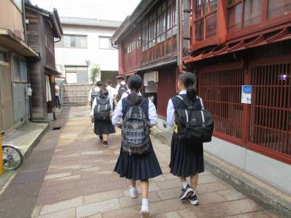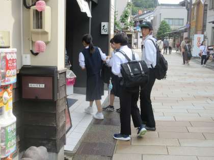 2学年 金沢校外学習 その5 ひがし茶屋街 公開日 2024/10/22 更新日 2024/10/22 第2学年 ひがし茶屋街です。 (写真上:早めに到着した班のようすです) (写真中:みんなでひがし茶屋街を散策します。意外と広い・・・) (写真下:「まだ回りたい所、ある?」) 「お昼ご飯は食べた?」 「おいしかったですー!」 「足りませんー!」いろいろ「食文化」に触れることができたようです。