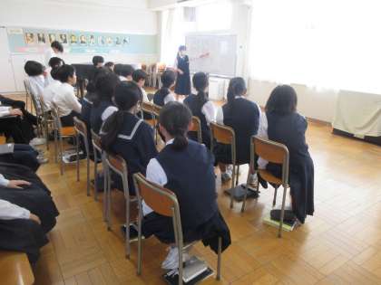 (写真上:2A 音楽 合唱リーダーが前に出て、曲想について紹介しています)