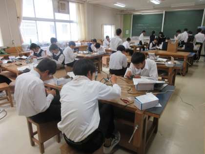 (写真下:2B 技術 ラジオ制作中です。電子工作に使うハンダごては、熱いので気を付けて!)
