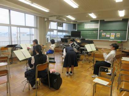 (写真上:吹奏楽部 ひたすら合わせる、合わせる、合わせる!)